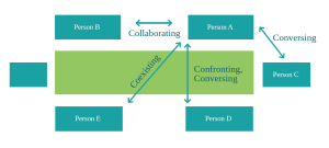 Second, concerning perspective, all three management approaches recognize that the organization is controlled by the people whose messages set the agenda.[20] An FBL approach assumes managers should determine what sorts of messages are sent in the organization: the messages should seek to maximize profits. A TBL approach offers a bit more voice to other stakeholders who can show how a firm can reduce negative socio-ecological externalities to optimize its financial well-being. A SET approach is even more inclined to invite multiple stakeholders to help set the organizational agenda for how best to enhance socio-ecological well-being while maintaining adequate financial well-being. This is consistent with the practices of deliberative dialogue. Deliberative dialogue gathers a variety of stakeholders together to learn ideas from one another about how to address an issue. Deliberative dialogue seeks to foster messages that promote collaboration and listening to find meaning and agreement. The messages are more concerned with showing concern for stakeholders and weighing alternatives than with defending the rightness of one’s own views.[21] As a result, the process helps to set an organization’s agenda that reflects the collective insights of its stakeholders.